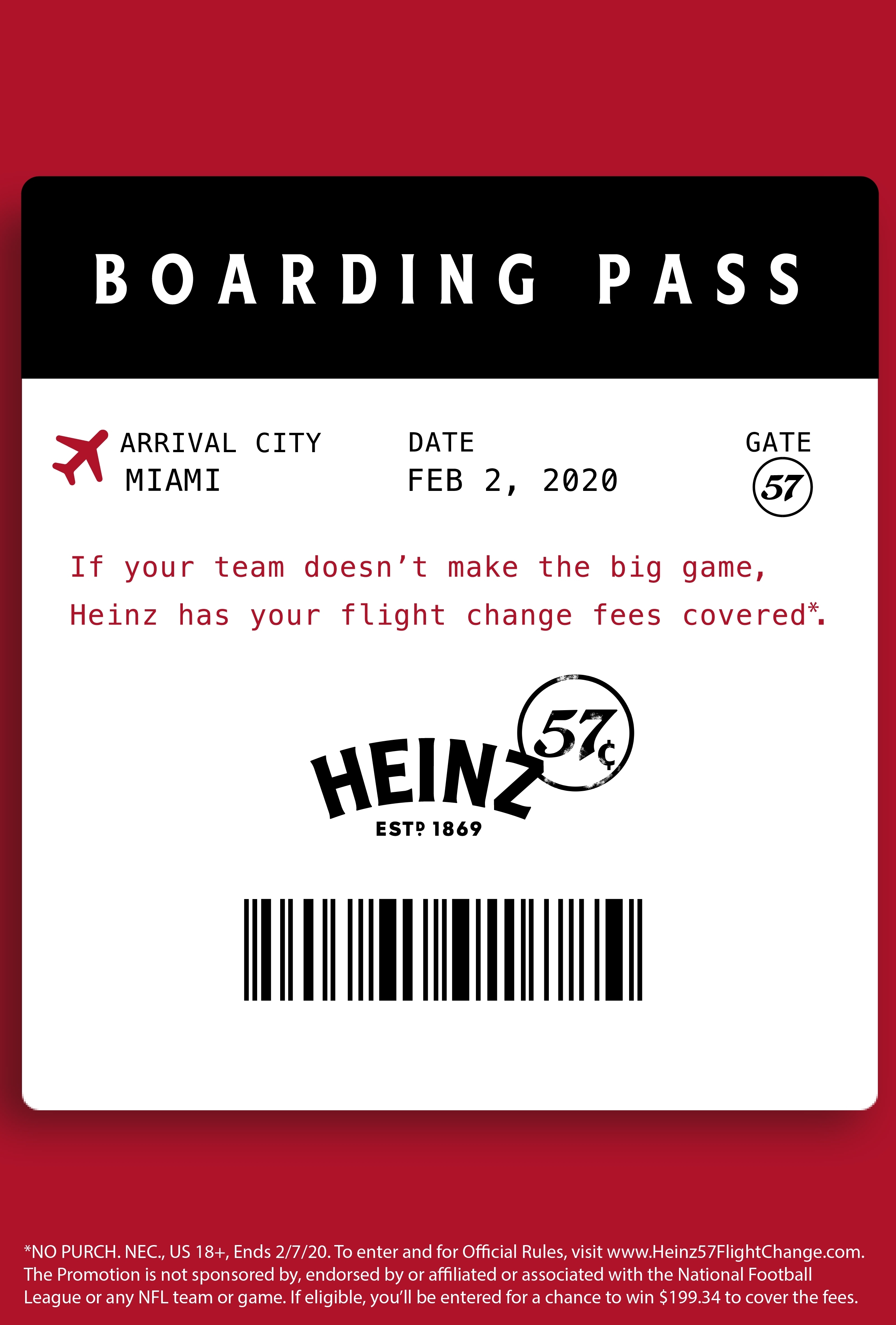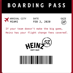 *NO PURCH. NEC., US 18+, Ends 2/7/20. To enter and for Official Rules, including additional eligibility requirements, visit www.Heinz57FlightChange.com. The Promotion is not sponsored by, endorsed by or affiliated or associated with the National Football League or any NFL team or game. If eligible, you’ll be entered for a chance to win $199.34 to cover the fees.