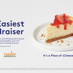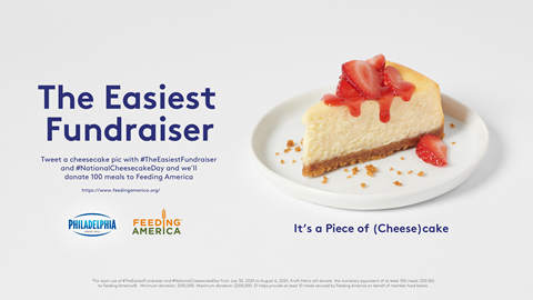 *For each use of #TheEasiestFundraiser and #NationalCheesecakeDay from July 30, 2020 to August 6, 2020, Kraft Heinz will donate the monetary equivalent of at least 100 meals ($10.00) to Feeding America®. Minimum donation: $100,000. Maximum donation: $200,000. $1 helps provide at least 10 meals secured by Feeding America on behalf of member food banks.