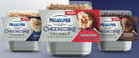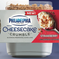 New Philadelphia Cheesecake Crumble are available in packs of two, convenient single-serve cups at retailers nationwide with a suggested retail price of $3.99. Philadelphia Cheesecake Crumble is a new line of indulgent, three-layer cheesecakes with fruit or chocolate sauce on the bottom, a rich and creamy cheesecake filling, and a graham cracker or cookie crumble topping. The product is available in 4 flavors – Strawberry, Original, Cherry and Chocolate Hazelnut.